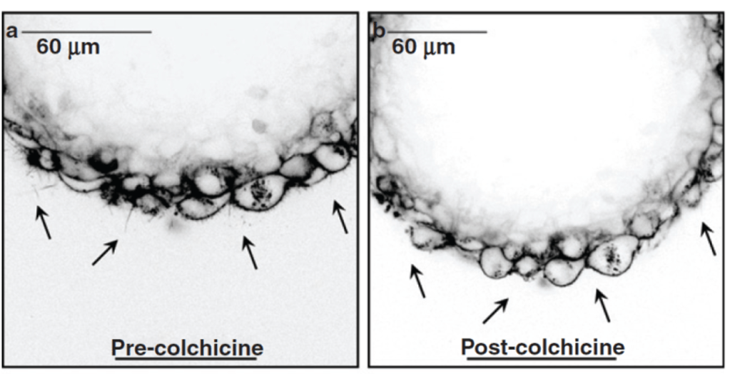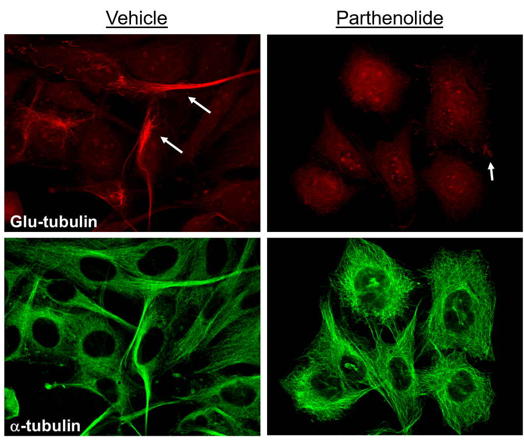 Charpentier, M.S., et al (2014). Cancer Research74(4):1250-60.Early CellMask Stain – Eric Balzer, unpublishedSelective effect of Parthenolide on Glu-tubulin (experiments from study listed below, but this image is unpublished)