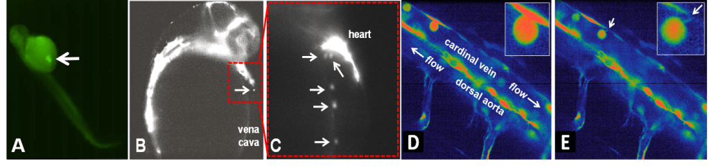 Whipple, R.A., et al (2013) Breast Cancer Research15(5):R83.Imaging MDA-231 cells circulating in zebrafish embryos. A) Zebrafish embryos with fluorescently-labeled vasculature (fli:eGFP) were injected with approximately 1000 human breast tumor cells (MDA-231) which were also labeled with GFP. Epifluorescence microscopy revealed the injected tumor cells (white arrow) in the yolk sac (Duct of Cuvier). B) Light sheet imaging allowed the visualization of GFP-labeled MDA-231 cells traveling via the vena cava (white arrow) toward the zebrafish heart. C) Higher magnification (inset red dotted line box) shows a continuous stream of MDA-231 CTCs entering the heart (white arrows). D) Nikon W1 spinning disk confocal microscopy (>200 frames per second) captures CTC rolling in the cardinal vein of the tail, and McTN binding to blood vessel walls (E, arrows).DIC Imaging of McTNs in live cells