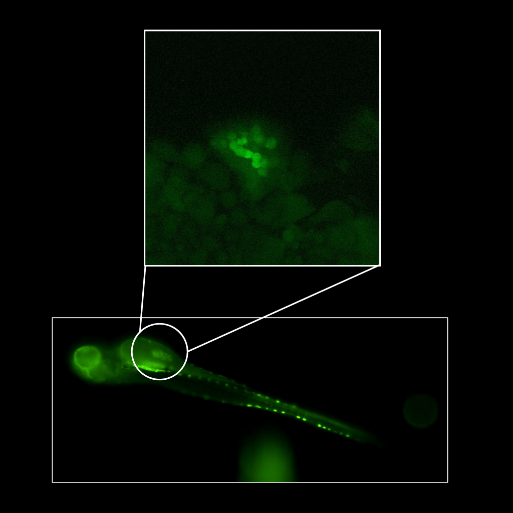 Yoon J.R., et al (2011). Breast CancerRes Treat. 129(3):691-701.Casper zebrafish injected with MDA-MB-231-GFP cells