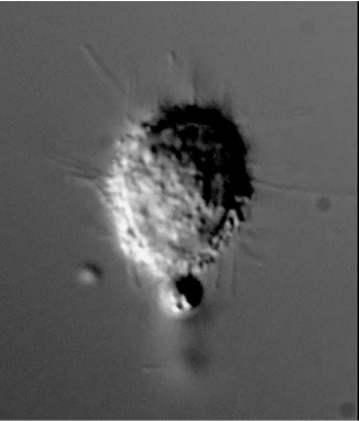 MDA-MB-436 cell tethered onto a TetherChip showing how the ends of free-floating microtentacles ball up when fixative is added.