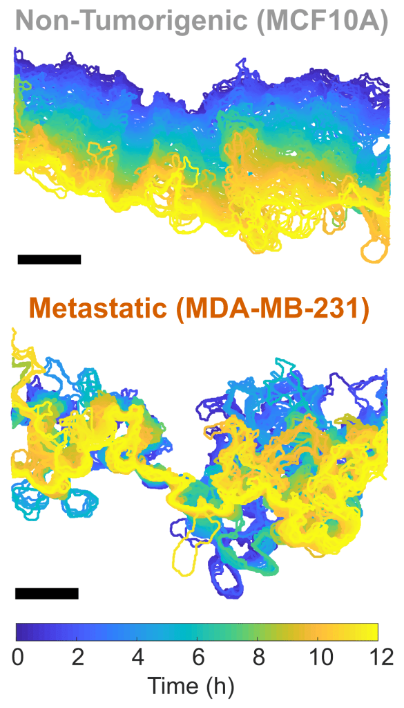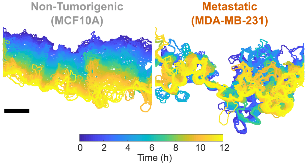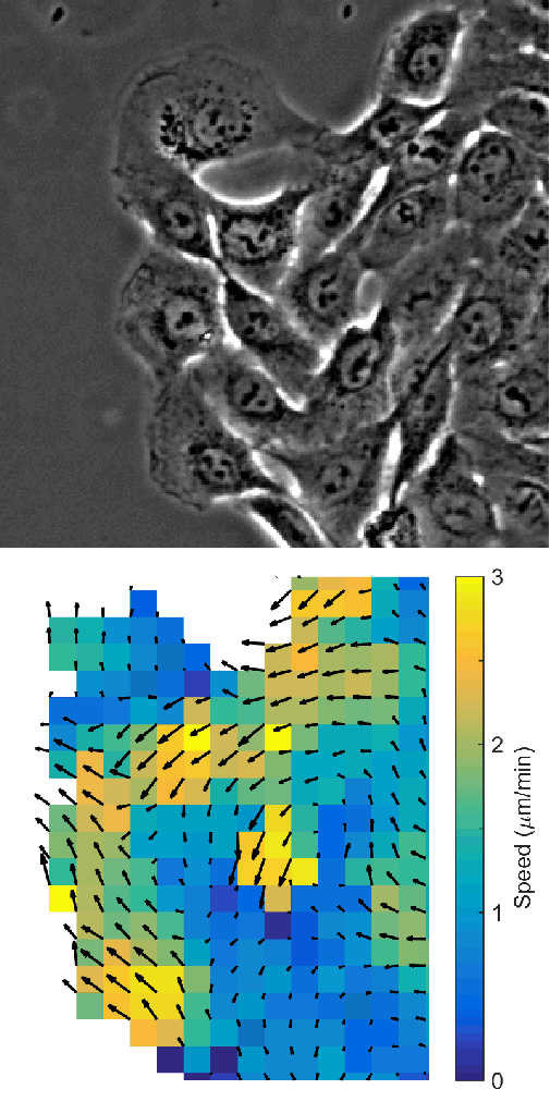 These images represent the leading-edge dynamics of a migrating collective sheet of cells. The non‑tumorigenic MCF10A show a smooth progression from 0 h (blue) to 12 h (yellow) while the metastatic MDA-MB-231 cells display a disordered progression. Scale bars indicate 100 µm. Lee, R. M., et al (2021). Scientific Reports 11, no. 1:10291.These images represent the leading-edge dynamics of a migrating collective sheet of cells. The non‑tumorigenic MCF10A show a smooth progression from 0 h (blue) to 12 h (yellow) while the metastatic MDA-MB-231 cells display a disordered progression. Scale bars indicate 100 µm. Lee, R. M., et al (2021). Scientific Reports 11, no. 1:10291.Image illustrates the use of particle image velocimetry (PIV) to extra motion information from a phase contrast image of MCF10A cells.Images by Dr. Rachel Lee